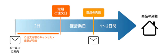 ※定期注文に関してはGW、年末年始などの長期休暇の際は連休明けの配送になりますので、事前にマイアカウントよりご希望の配送日に変更をお願いします。